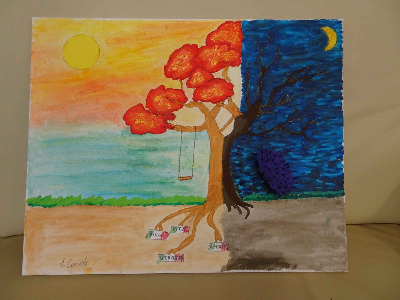 Rappresenta uno spazio e un tempo divisi, tra ciò che era un passato, pieno di vita e di luce, ricco di sentimenti positivi, descritti da delicati colori ad acquerello, ed un presente più cupo, ritratto tramite colori ad olio, una notte illuminata solo da una falce di luna, dove risalta un coronavirus creato attraverso materiale riciclato, sporgente rispetto al quadro, quasi a rappresentare la sua estraneità a una realtà di cui sembra essersi impossessato.